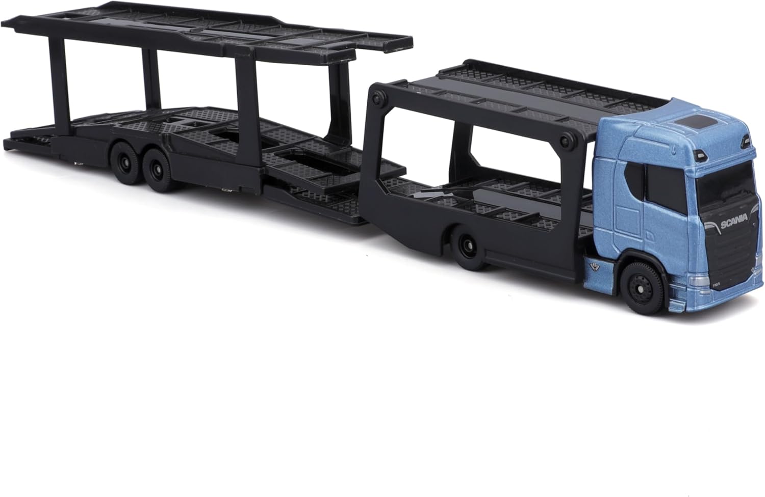 - Surtido de camiones 1/72 con remolque: Este set incluye 4 modelos aleatorios de camiones de metal a escala 1/72, con remolque, que representan marcas emblemáticas como Scania y Volvo.