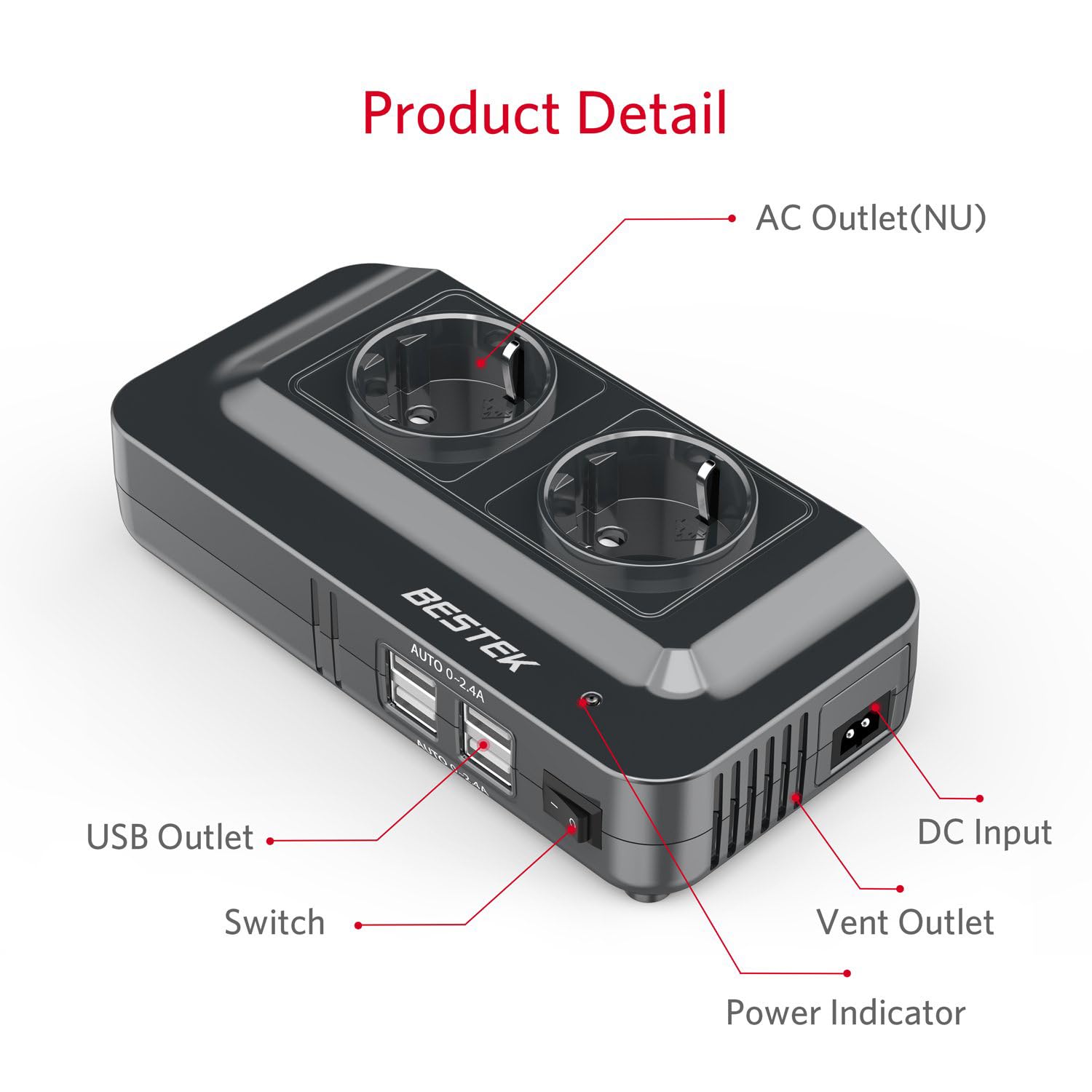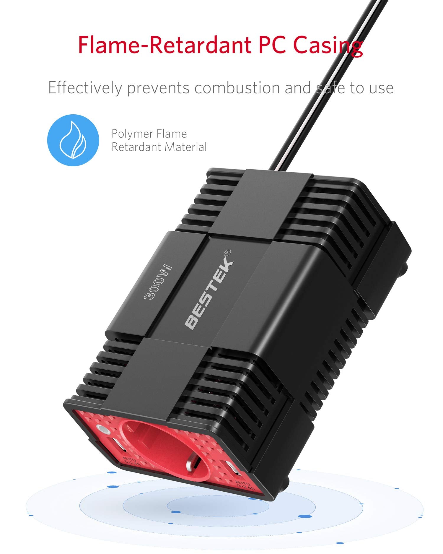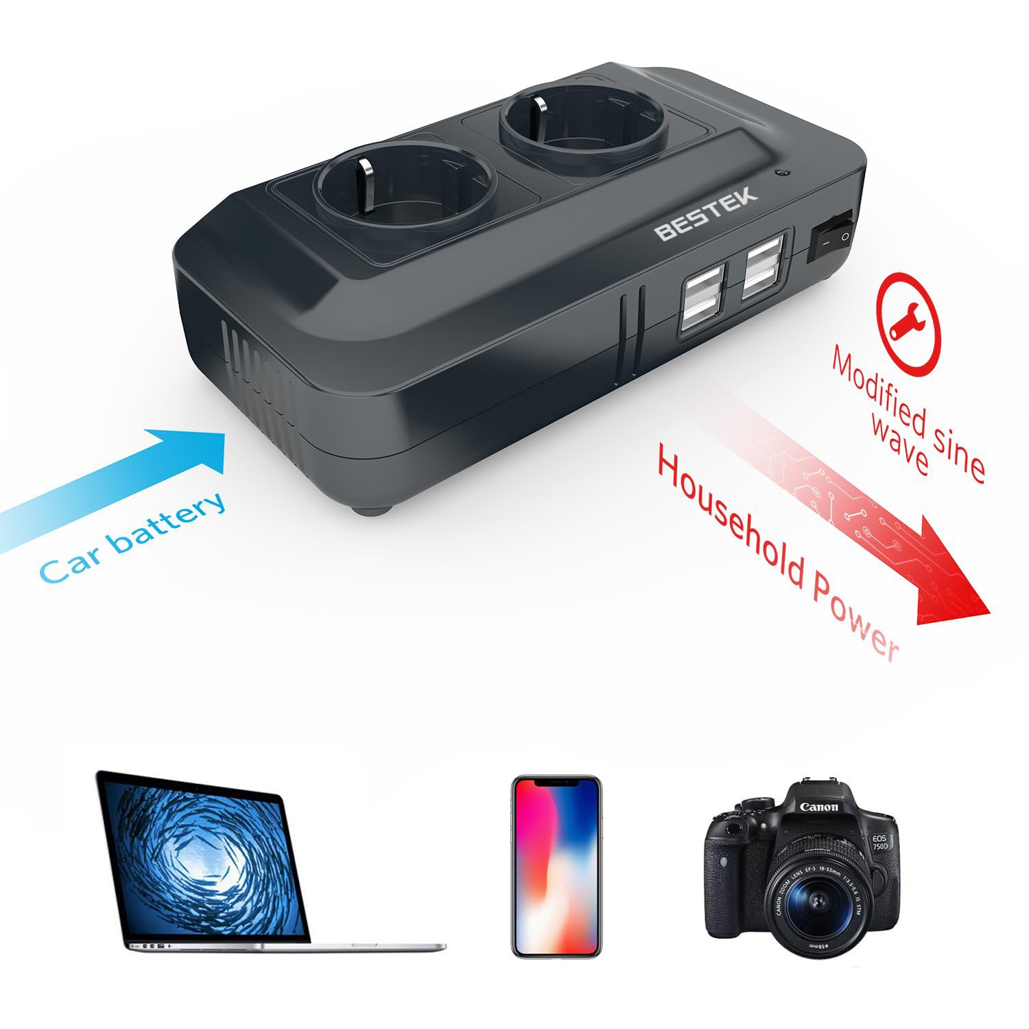 BESTEK - Convertidor de 12 V, 220 V, 230 V, 200 W, Transformador de tensión, 4 Puertos USB y 2 enchufes UE, Cargador de Coche para Camping con múltiples Protecciones y Soft Start