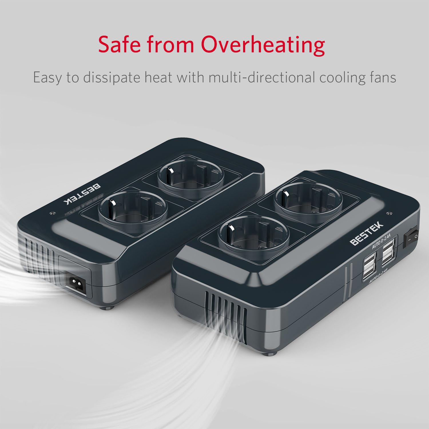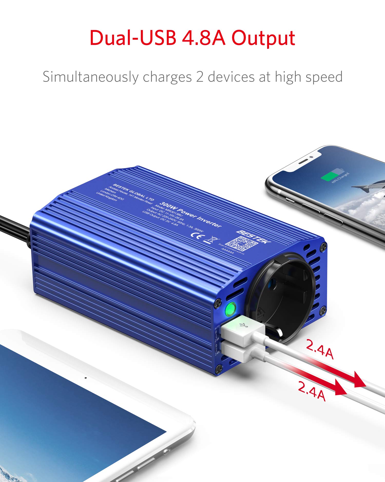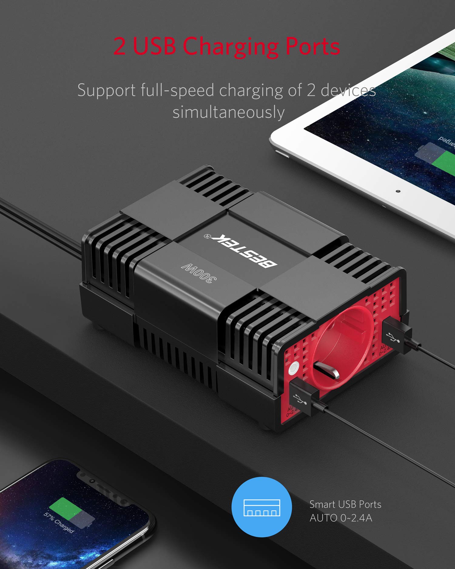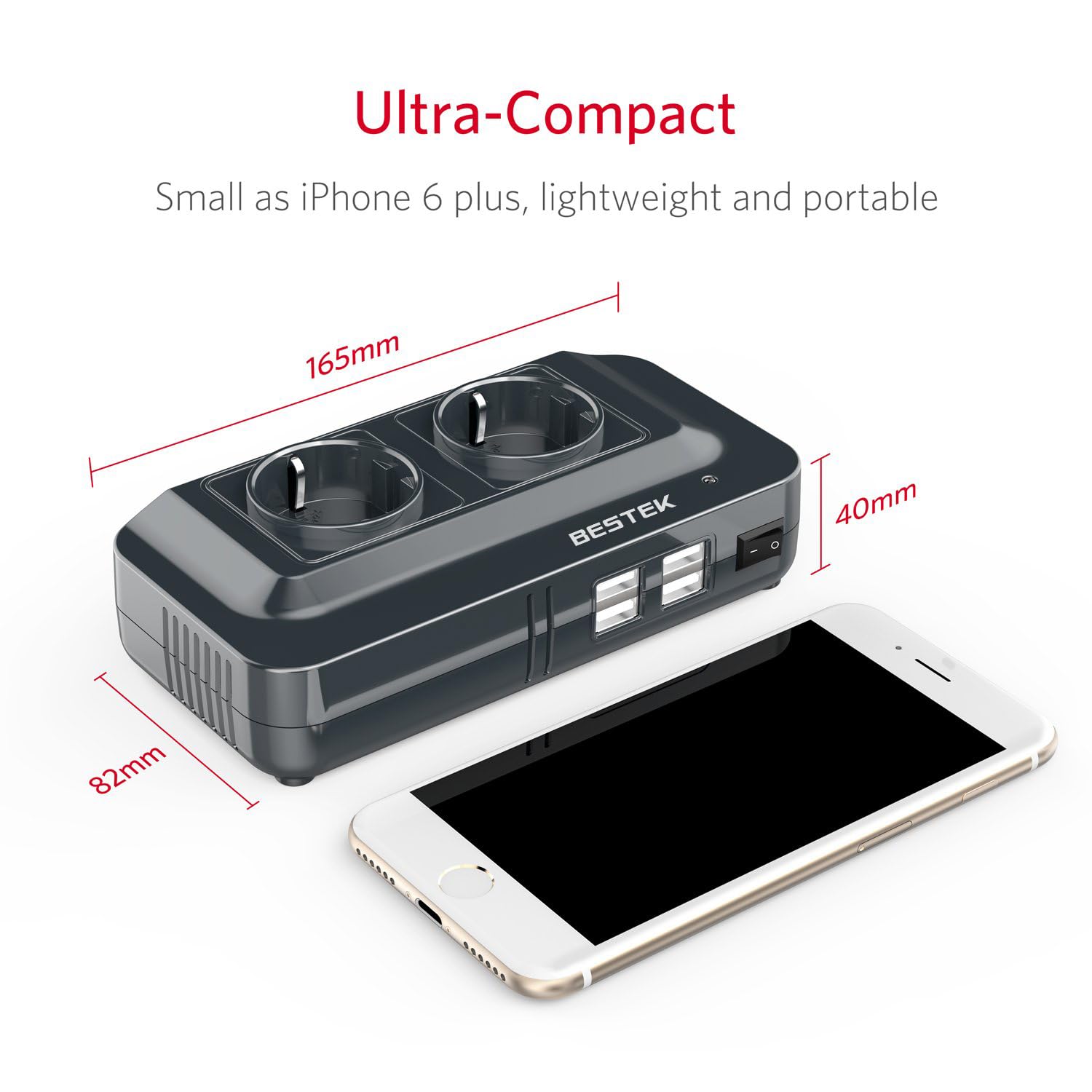 BESTEK - Convertidor de 12 V, 220 V, 230 V, 200 W, Transformador de tensión, 4 Puertos USB y 2 enchufes UE, Cargador de Coche para Camping con múltiples Protecciones y Soft Start