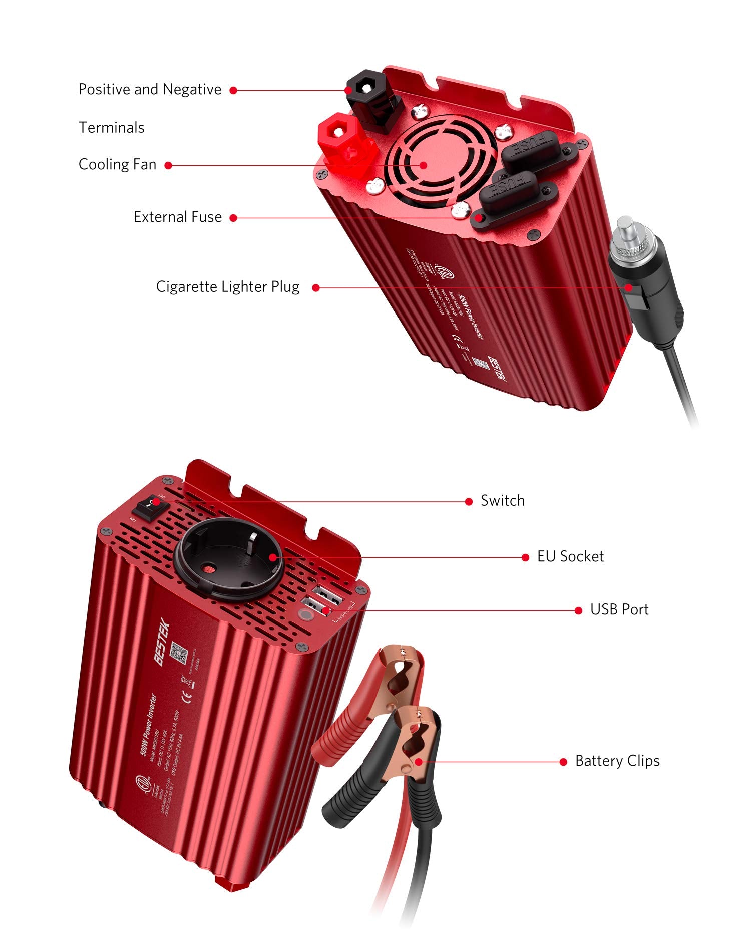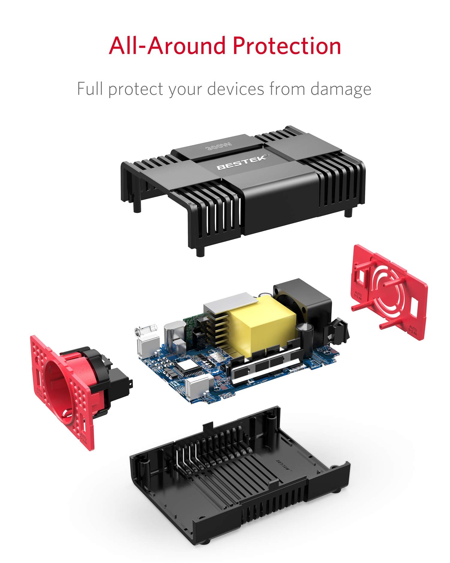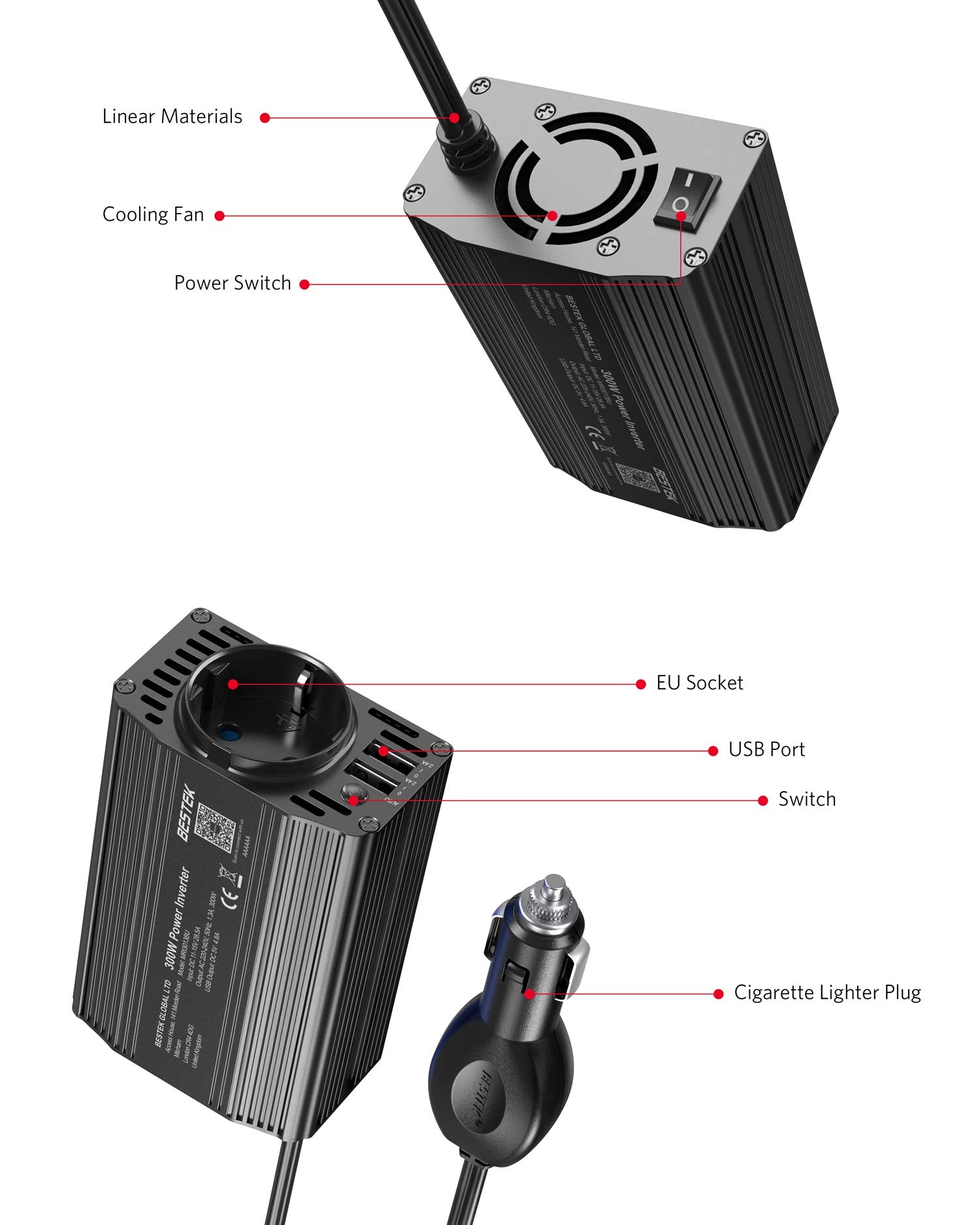 - [Atención] BESTEK es una marca registrada de los Estados Unidos, European Union y nuestro único distribuidor autorizado es BESTEK. Tenga cuidado para evitar comprar estos CONVERTIDORES de otros vendedores, garantía 100% original de BESTEK. Venta no autorizada sin autorización, investigaremos la responsabilidad legal. Lista de paquetes: 1 convertidor de corriente, 1 cable con la toma de encendedor de coche (80 cm), 1 manual de usuario en francés.