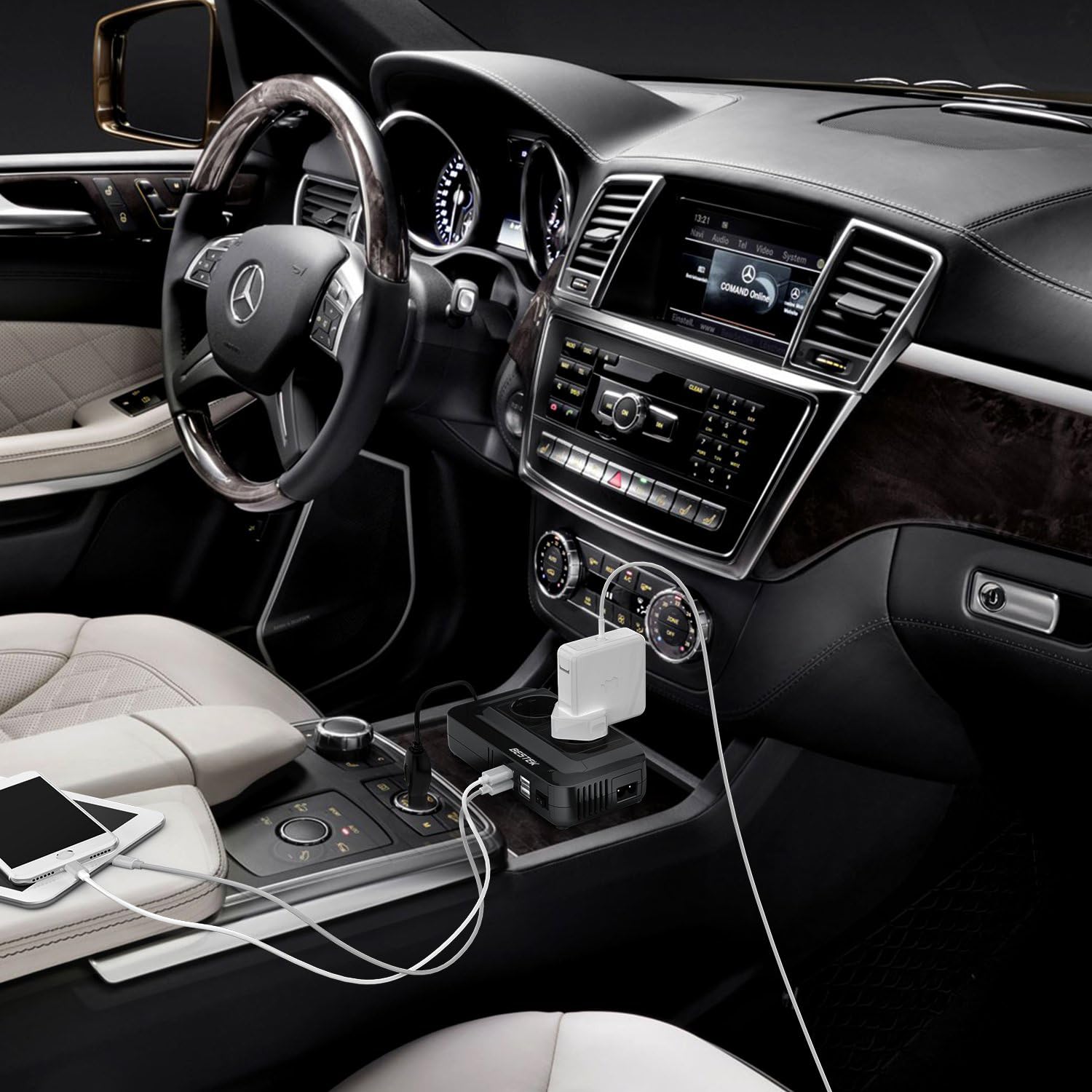 - [4 puertos USB (4,2 A)] Convierten la entrada DC 12 V en la salida AC 5 V USB, permite la carga rápida de los dispositivos smartphone, Pad (con identificación universal).