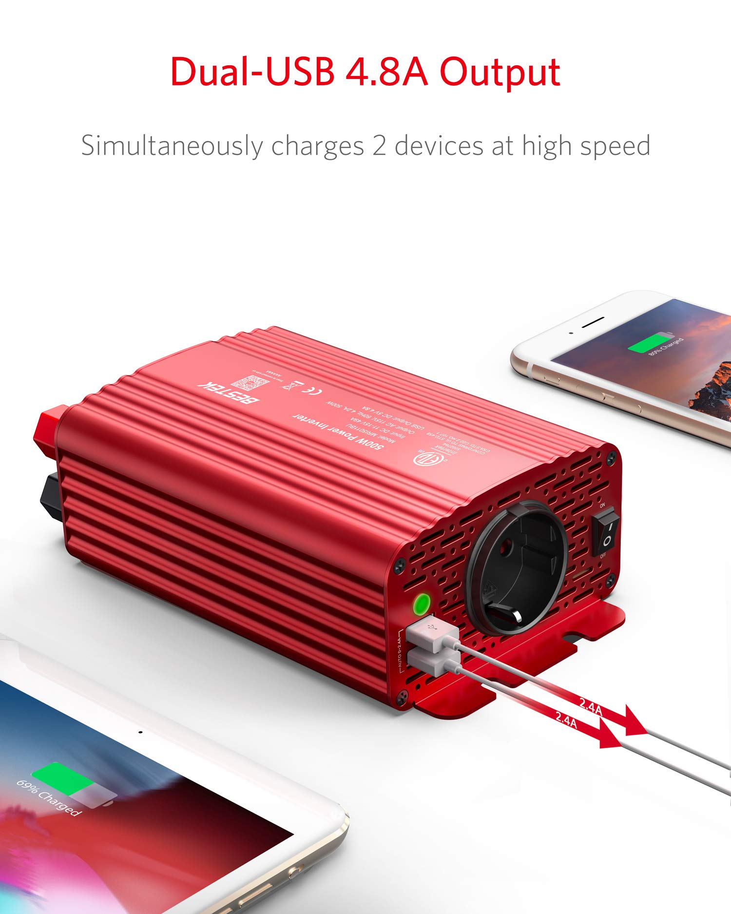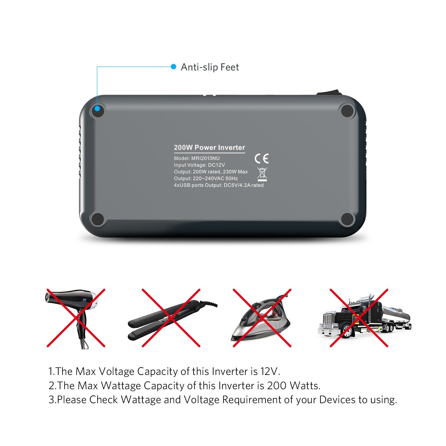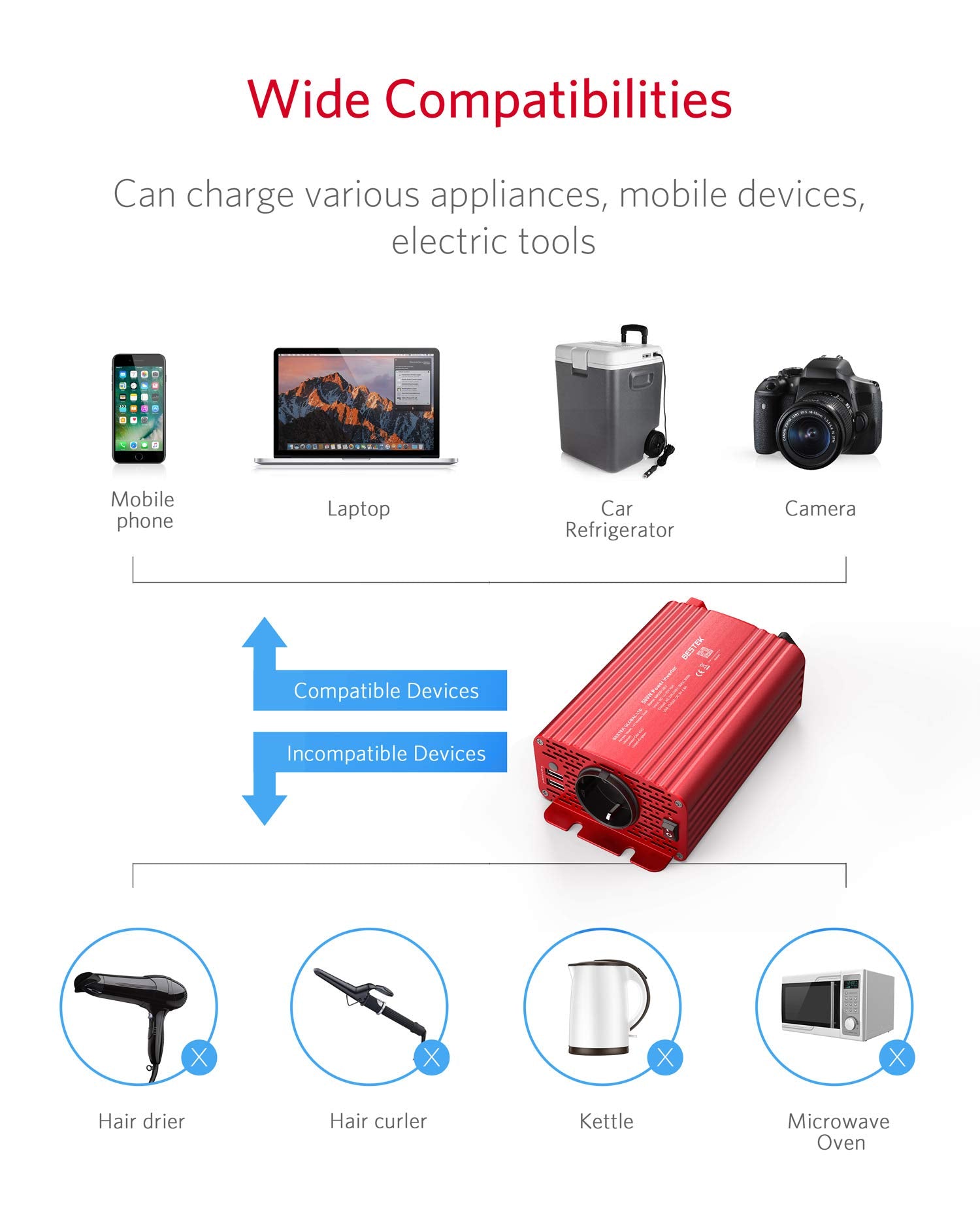 - [Mejora] Nueva versión en negro, materiales mejorados, carcasa más resistente y repele la suciedad. 2 enchufes EU – convierte la tensión de la batería entrante de CC 11 V – CC 15 V (coche, barco, autocaravana) a CA 230 V ± 10 V (± 50 Hz 3HZ, similar a la de la casa) en salida, inversor de vehículo con una potencia de 200 W, para cargar portátil, cámara, drone, sistemas de navegación, etc.