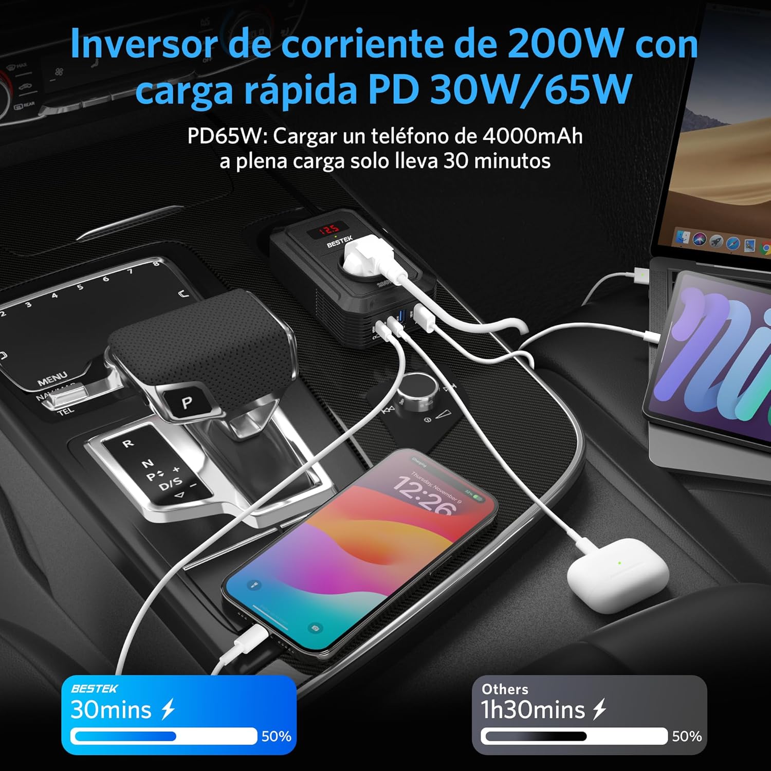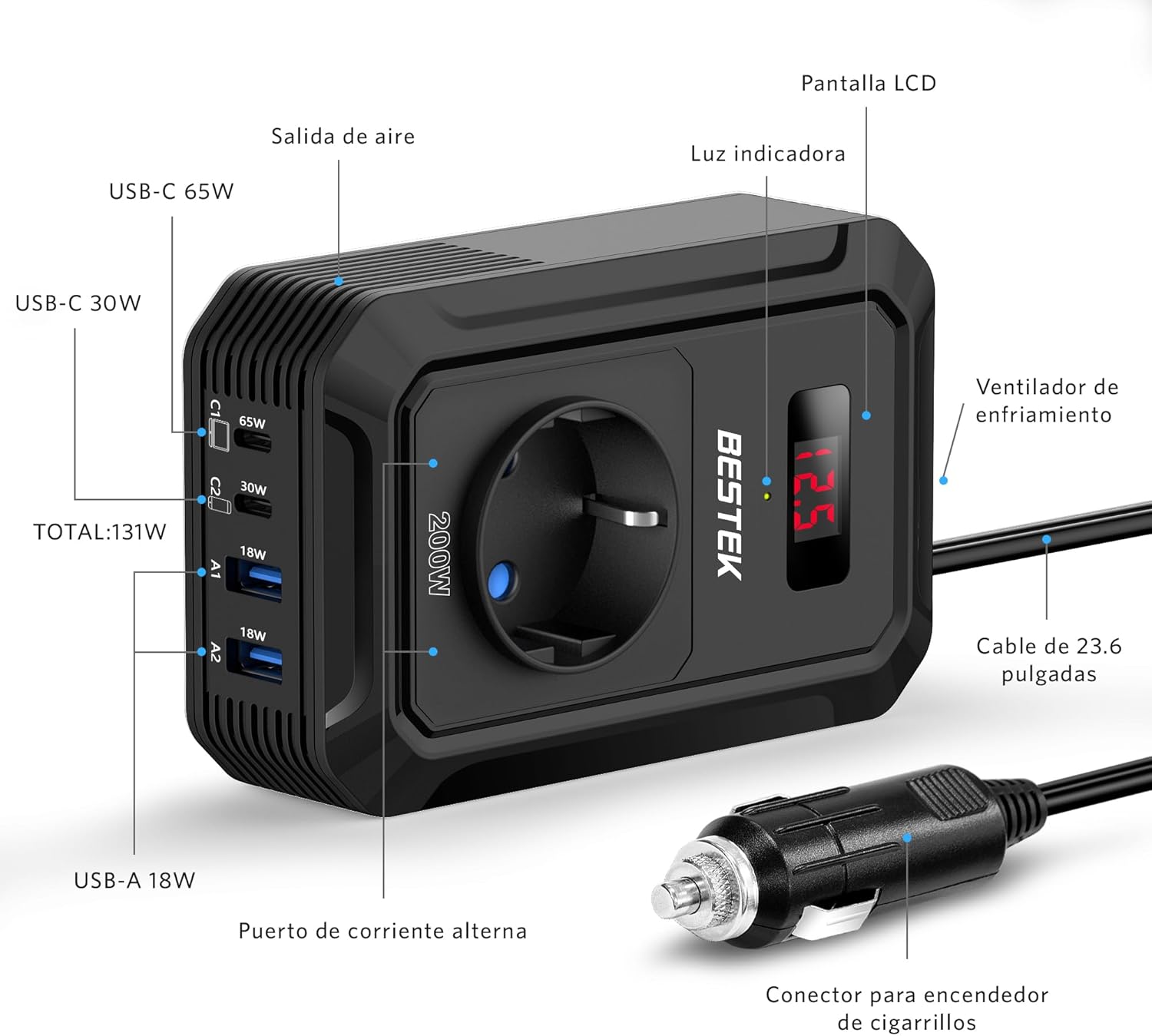 - 【Inversor de corriente DC 12V a AC 240V】Inversor de corriente BESTEK 200W de 12V a 240V con tomas universales de EU y 4 puertos USB (2*18W USB-A + 30W QC3.0 Tipo C + 65W QC3.0 Tipo C), proporciona una potente carga de 200W para portátiles, tabletas, teléfonos, sacaleches, Kindles, dispositivos GPS, equipo de camping y equipo de oficina móvil. NOTA: Por favor, asegúrese de que la potencia de su dispositivo y su corriente actual sean inferiores a 200W, de lo contrario sus dispositivos no serán compatibles.