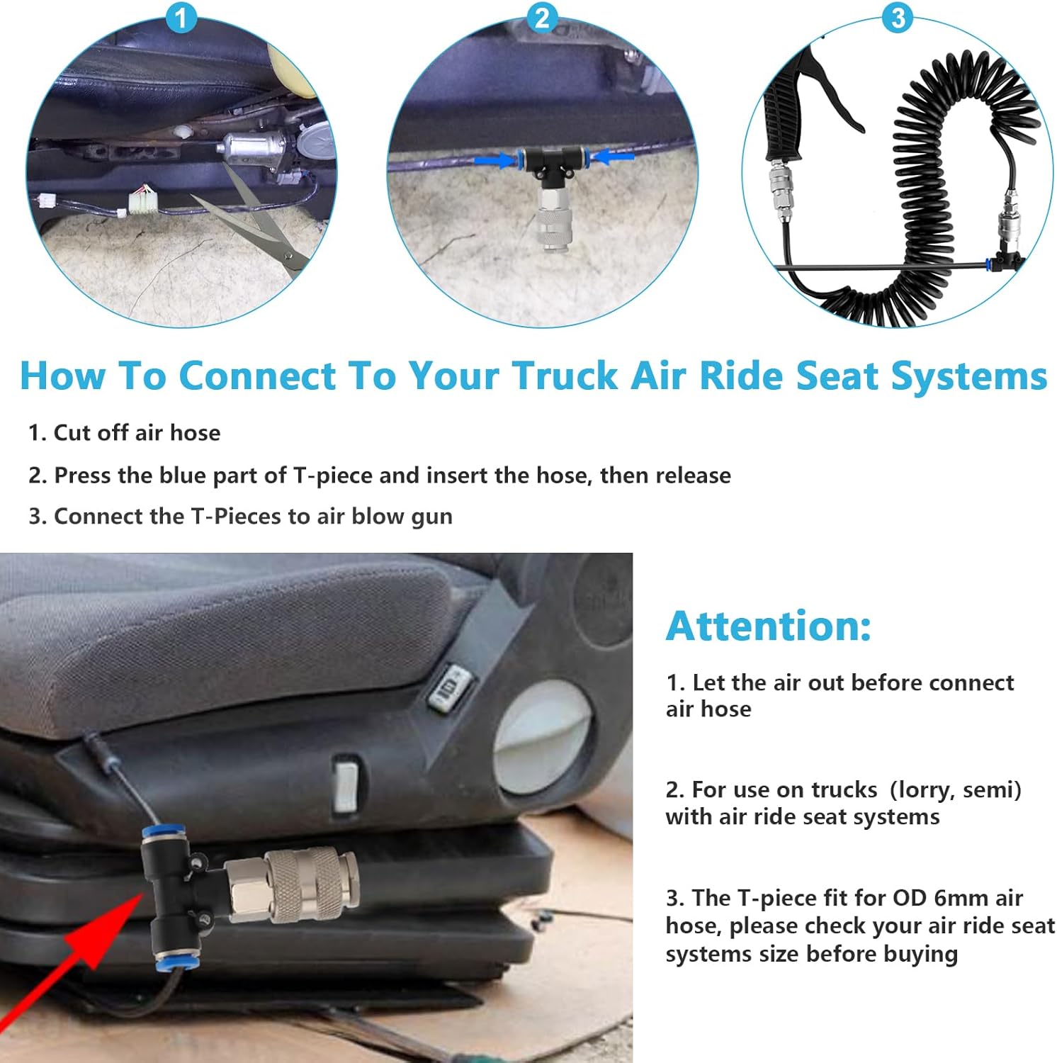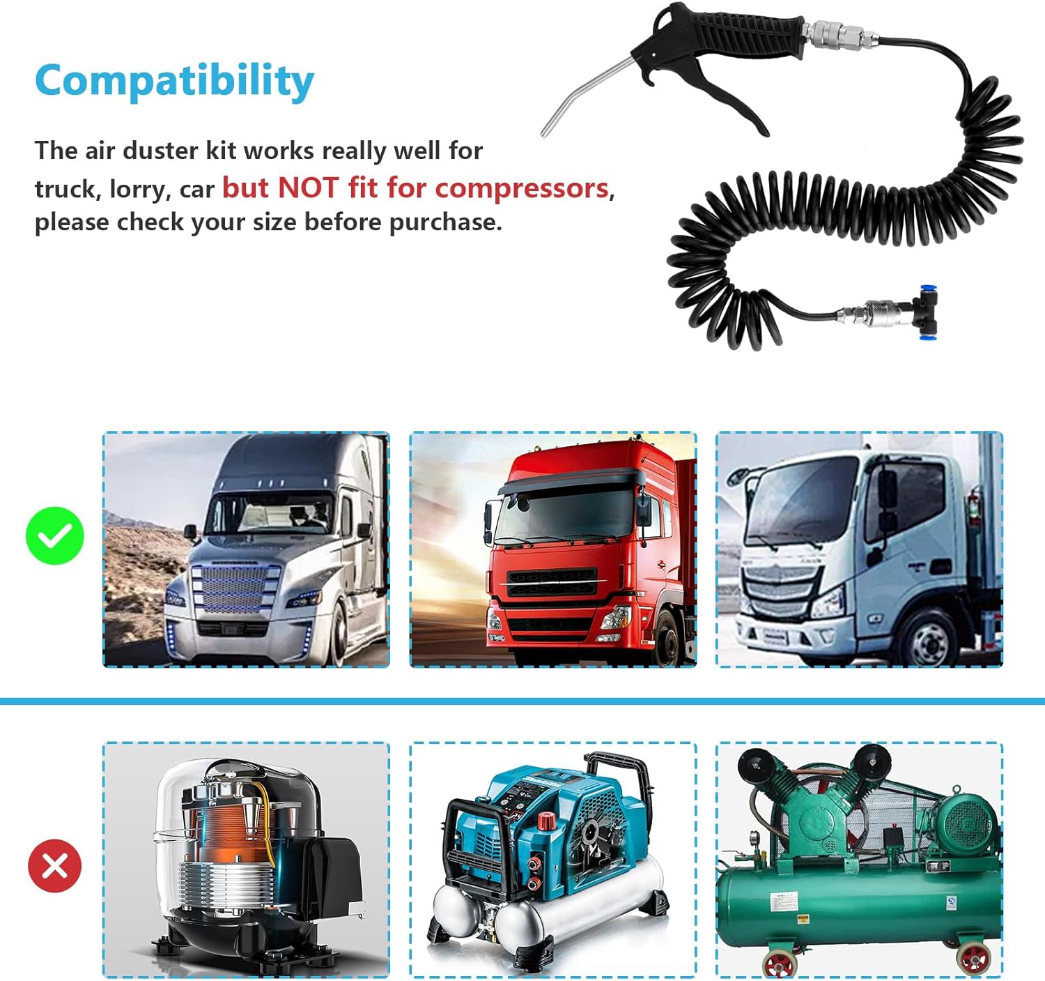 - 【Preste atención a la compatibilidad】El kit de pistola de soplado de aire está diseñado para camiones equipados con sistemas de asiento neumático y se utiliza para tareas de limpieza desde la cabina hasta el coche cama. Funciona muy bien para camión, camión, coche. PERO NO SE PUEDE CONECTAR AL COMPRESOR del camión.