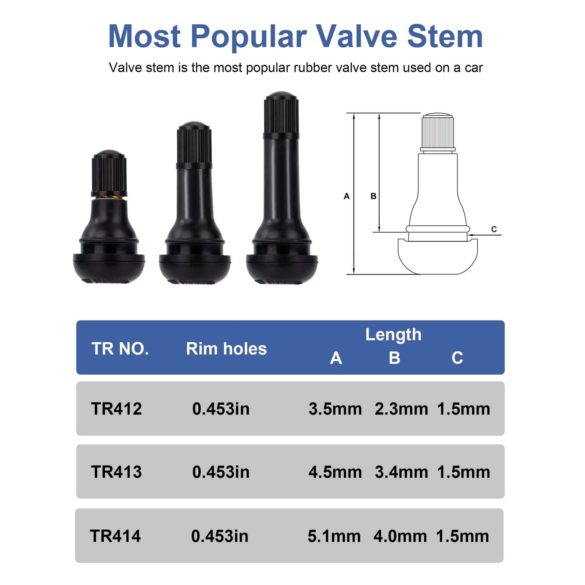 2.Vástagos de Válvula a Presión Negros: Incluye vástagos de válvula a presión negros TR412, TR413 y TR414, fáciles de instalar y quitar para un mantenimiento y reparaciones eficientes.