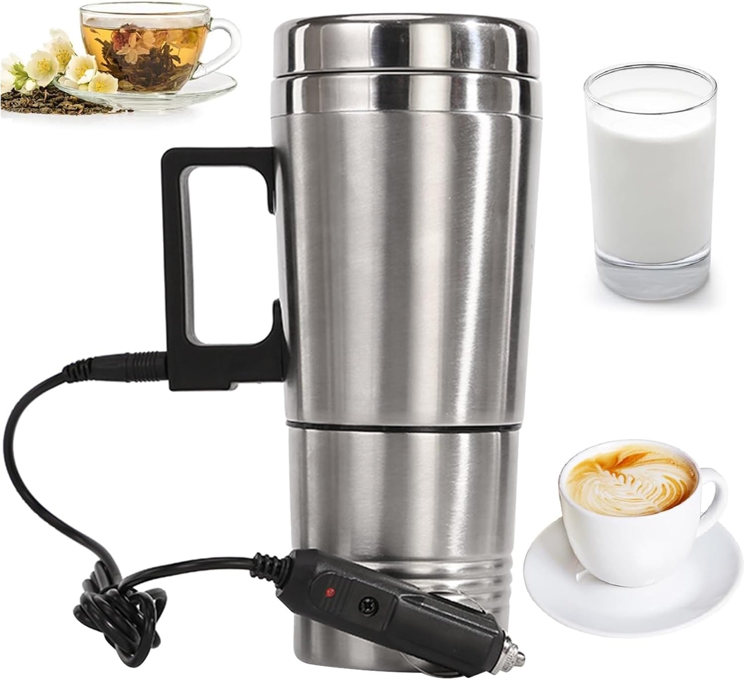 - 【Diseño ergonómico】Se adapta a la mayoría de portavasos de vehículos. La tapa calefactora para automóvil de acero inoxidable de 12 V/24 V se coloca cómodamente en el portavasos de su automóvil y se conecta al encendedor de cigarrillos para mantener su bebida caliente.