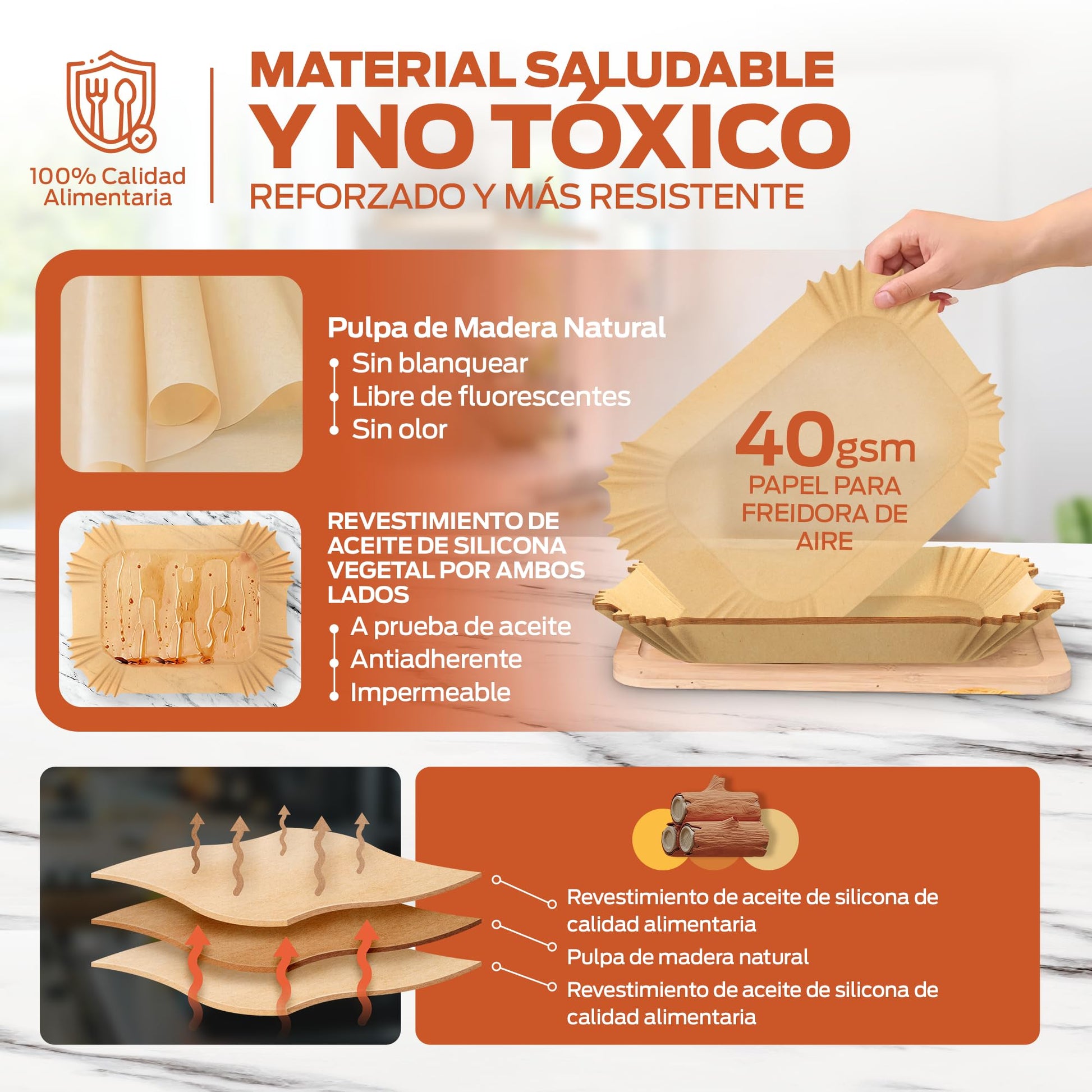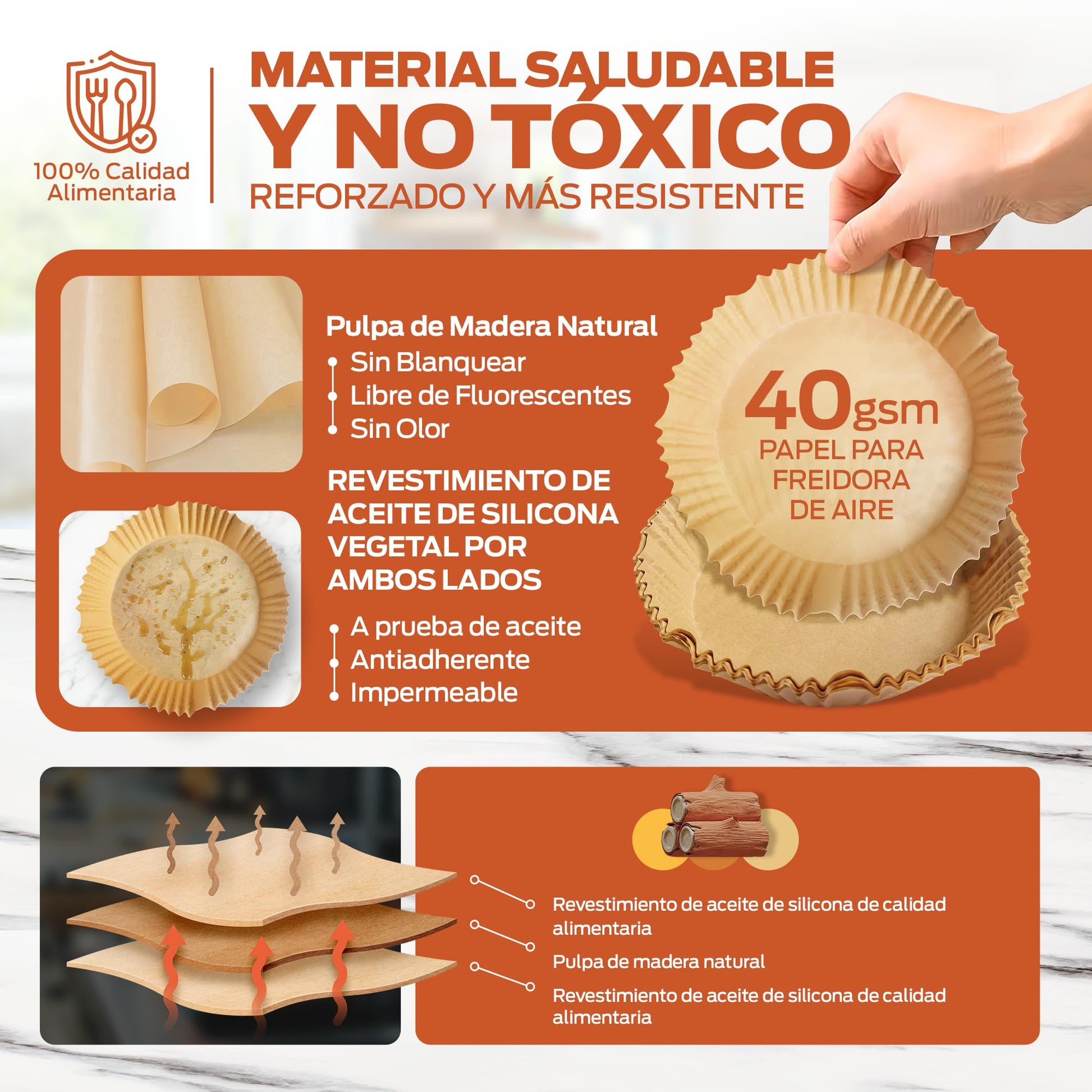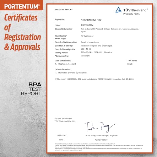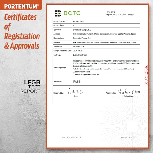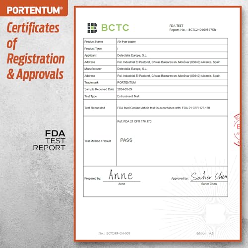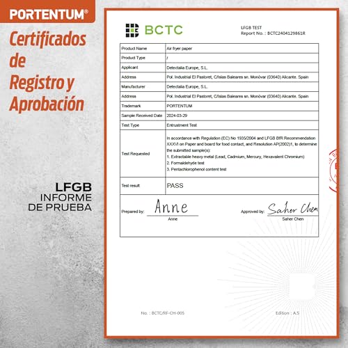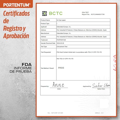 - GRADO ALIMENTICIO CERTIFICADO. Nuestro papel para freidora de aire está fabricado con materiales seguros para alimentos, sin Bisfenol A (BPA), cumpliendo los estrictos estándares de calidad y seguridad de Alemania (LFGB) y las regulaciones de la FDA de Estados Unidos, garantizando que no transfiera sustancias tóxicas ni altere los alimentos.