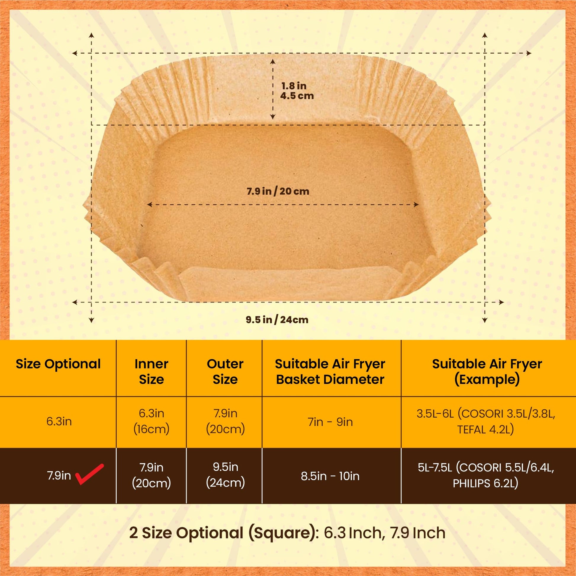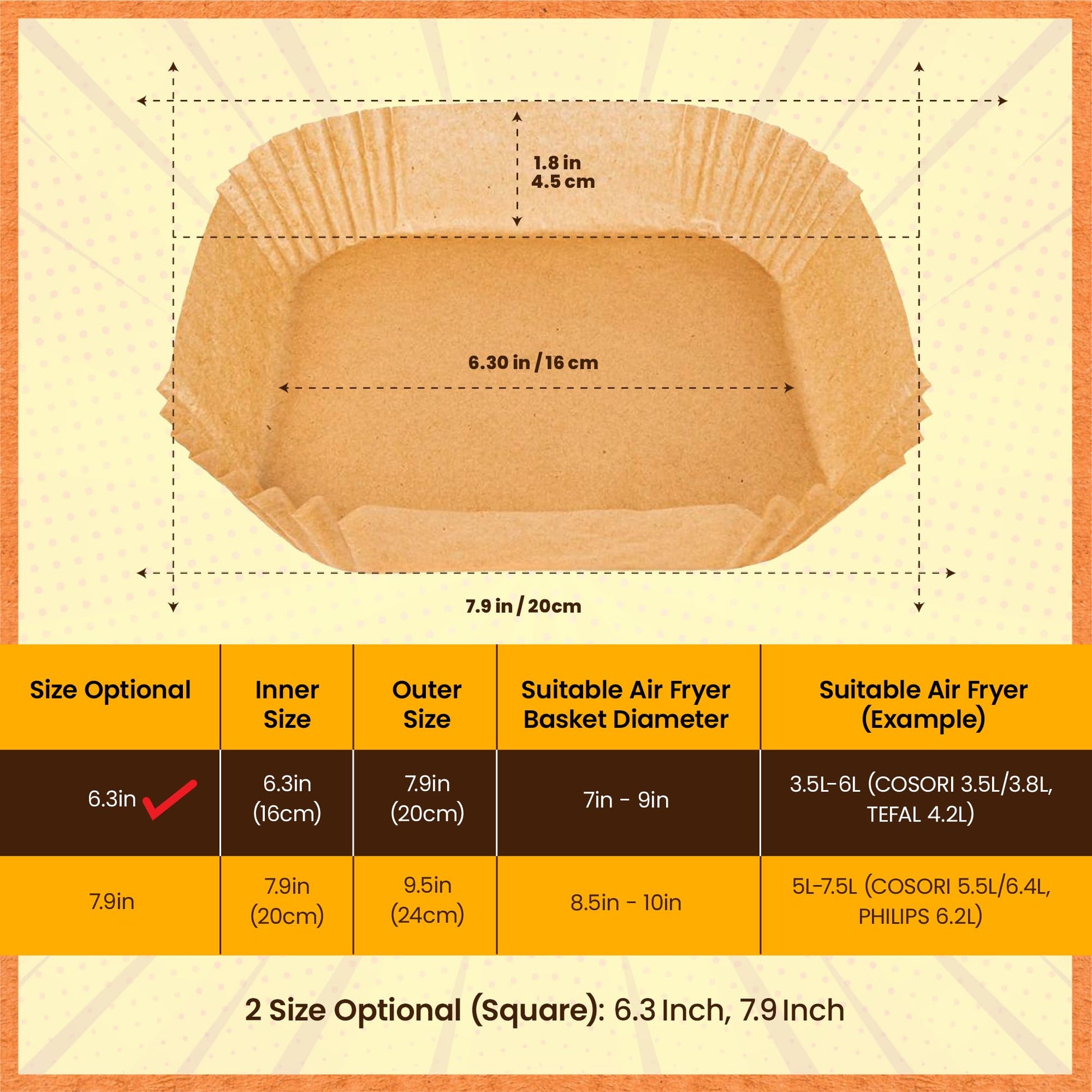 - COMPATIBLE CON CUALQUIER MARCA. Diseñado para adaptarse a cualquier marca de freidoras de aire de entre 3,5L y 10L. Elige la forma y el tamaño ideal para ti. Disponible en papel cuadrado, redondo (ambos de 16-20 cm o 20-24 cm) o rectangular (22 x 14 cm) para freidoras de aire dual.
