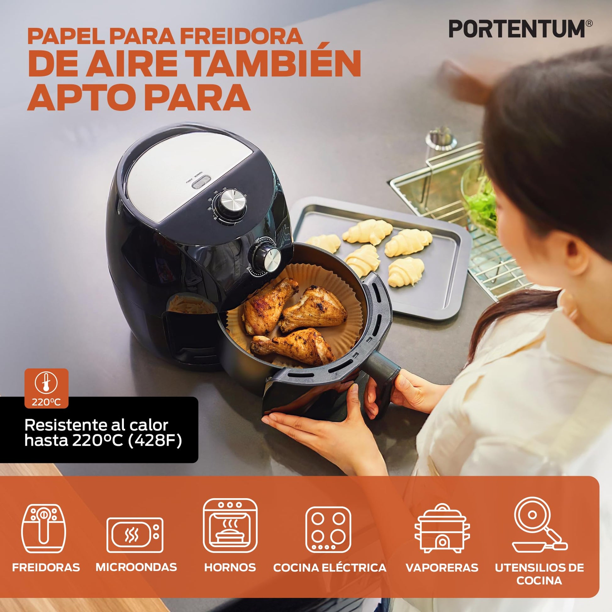PORTENTUM Papel freidora aire 100 unidades de 20-24 cm Cuadrado. Papel Air Fryer Grado alimenticio BPA free, FDA y LFGB