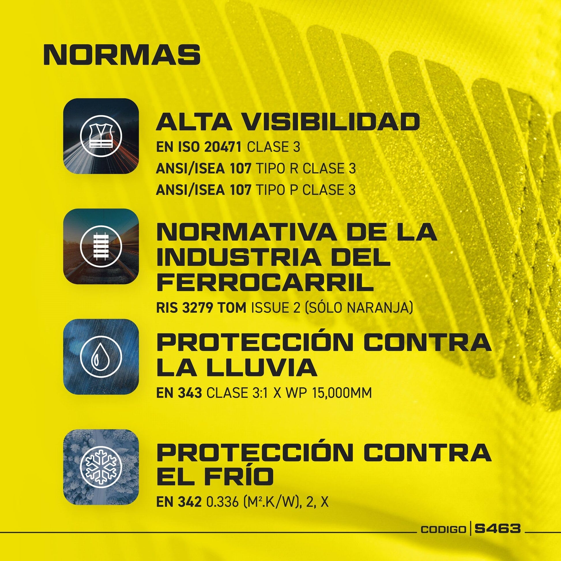 - NORMAS: SATRA Technology Europe Ltd; EN ISO 20471 Class 3; RIS 3279 TOM Issue 2 (Orange Only); EN 343 Class 3:1 X (WP 15,000mm); EN 342 (0336 (M²K/W), 2, X); ANSI/ISEA 107 TYPE R CLASS 3.
