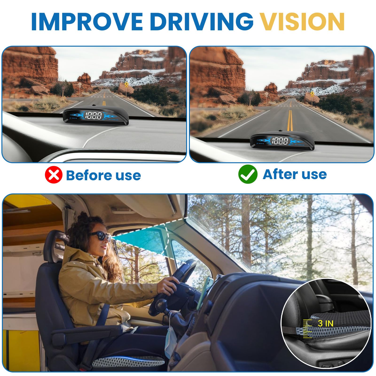 - [mejorar la visión de la conducción]: El espesor del cojín de nuestro automóvil es de 3 pulgadas para mejorar su perspectiva al conducir. La almohadilla de espuma de memoria está diseñada para ser delgada en la parte delantera y gruesa en la parte trasera, adelgazando gradualmente debajo de las piernas. El cojín del coche también es bueno para las personas de baja estatura, ya que puede levantar y bajar 3 pulgadas en el asiento y conducir en la postura correcta