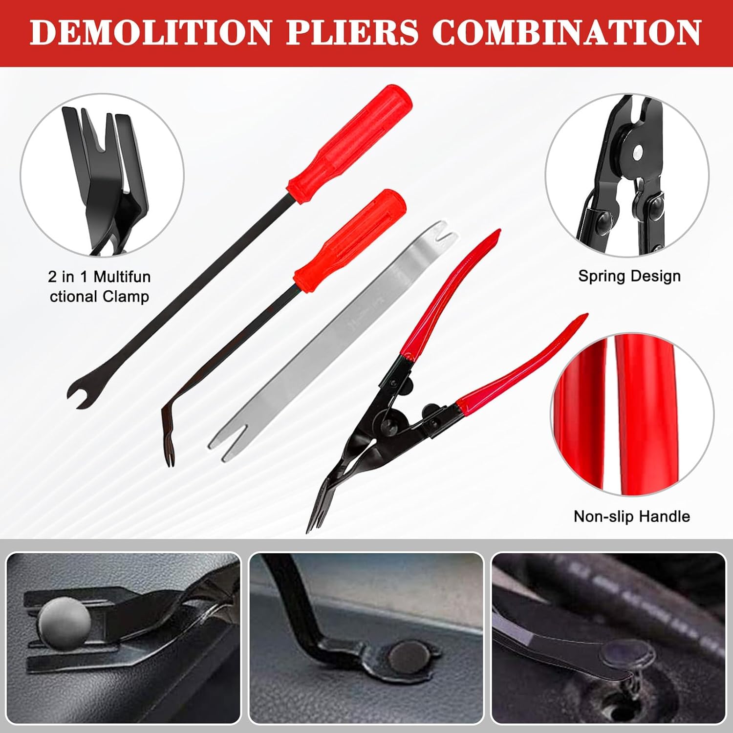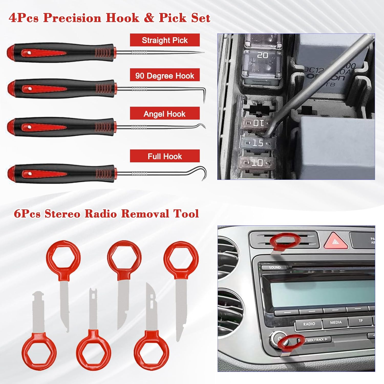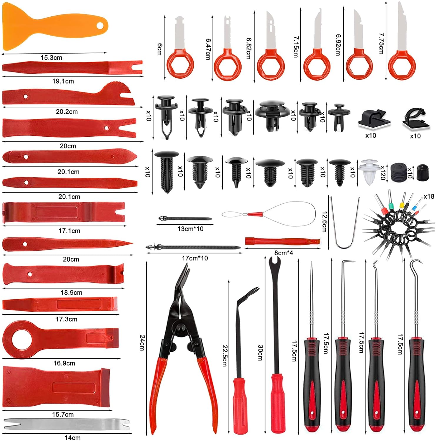 - [FÁCIL DE ALMACENAR Y UTILIZAR] Esta herramienta de desmontaje tiene un diseño ergonómico y es fácil de sostener, lo que logra resultados más eficientes y que ahorran mano de obra. El rico contenido es adecuado para todo tipo de automóviles. El kit también viene con una bolsa portátil con cremallera para un fácil almacenamiento y organización