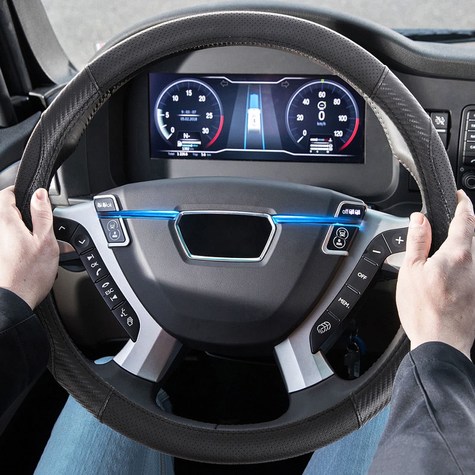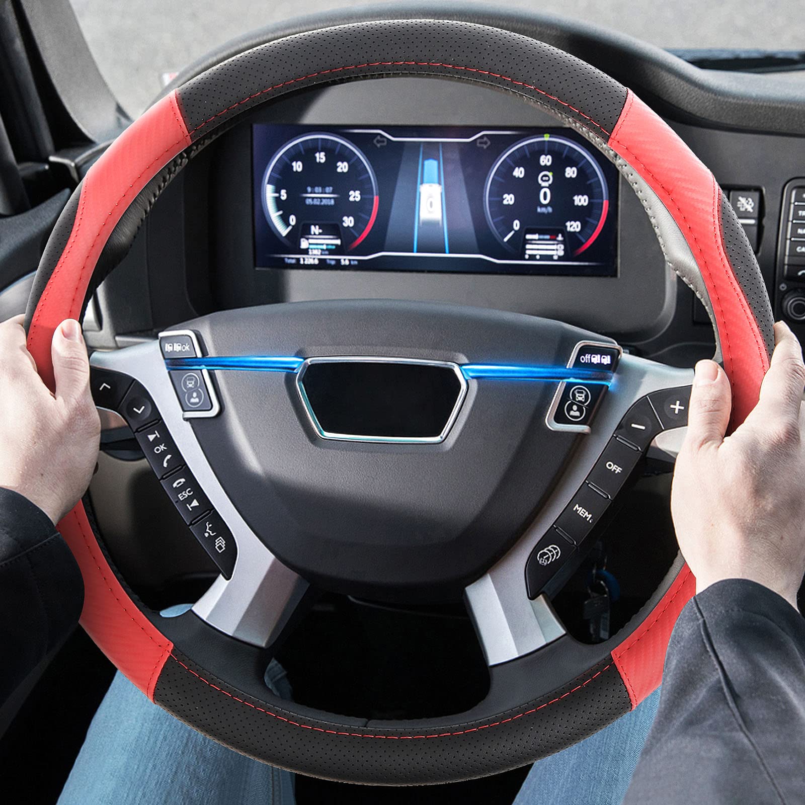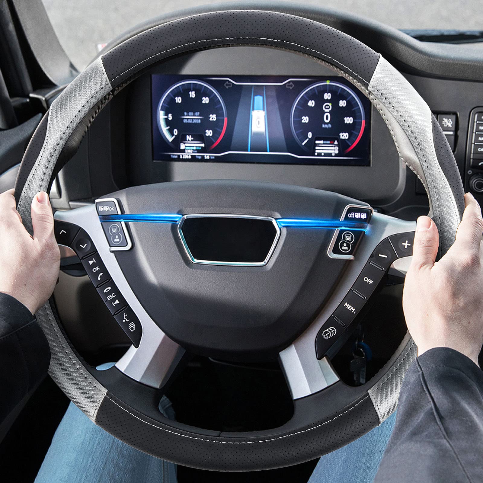 - Materiales de alta calidad:La funda para volante del camión está hecha de cuero de PU de alta calidad con cuero de fibra de carbono. Es resistente al sudor y la suciedad y fácil de limpiar con una toalla húmeda